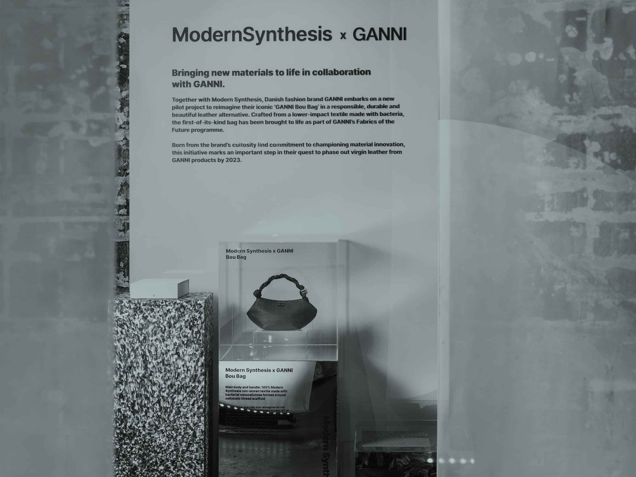 Unveiled at London Design Week 2023, the collaboration reimagines GANNI’s much-loved “Bou Bag” – previously made from a mix of materials, including recycled leather, polyurethane, recycled cotton and polyester – in Modern Synthesis’ bacteria-based alternative material, bacterial nanocellulose, described as “a particularly strong and fine form of cellulose derived from bacterial fermentation.”